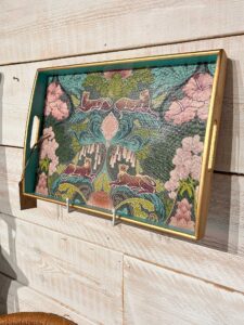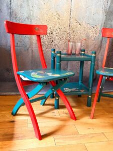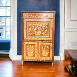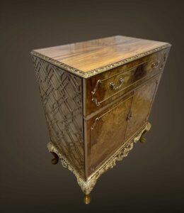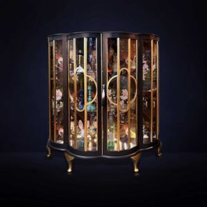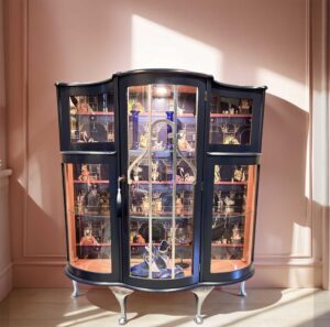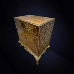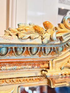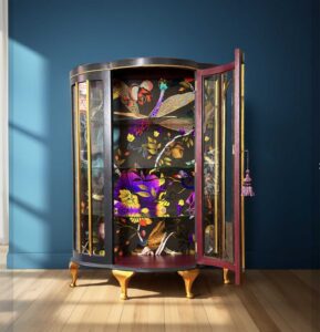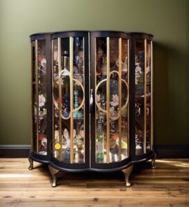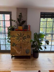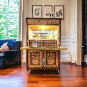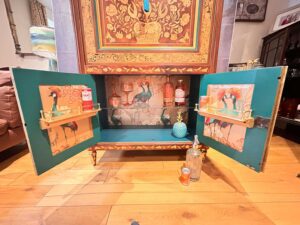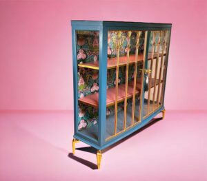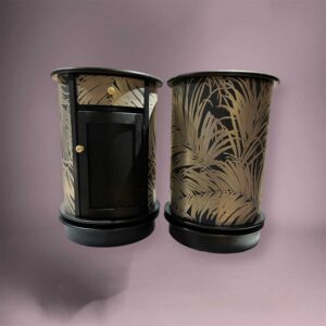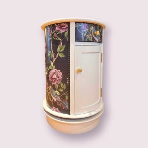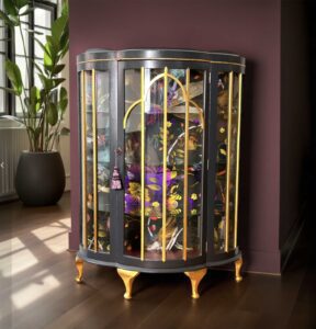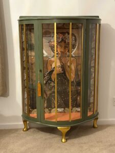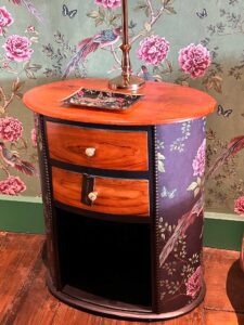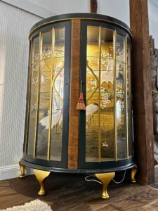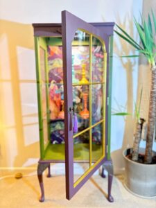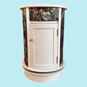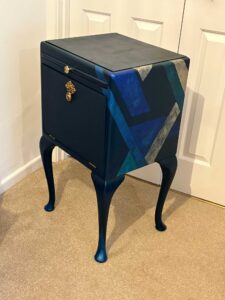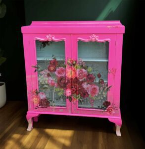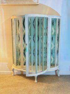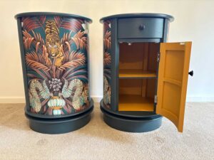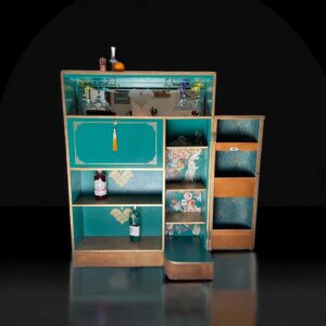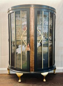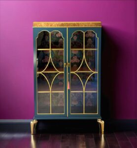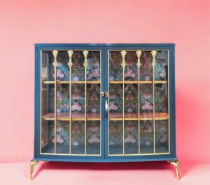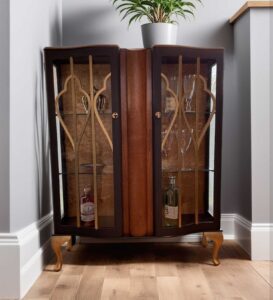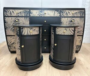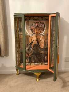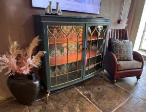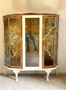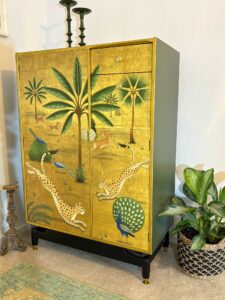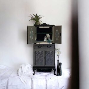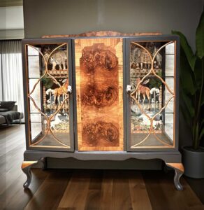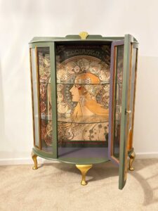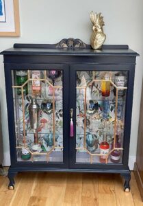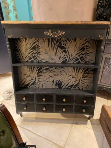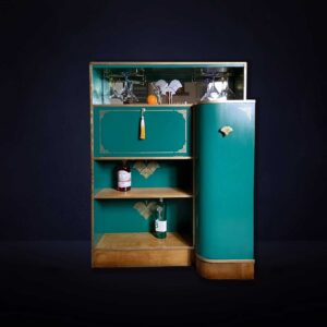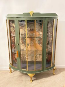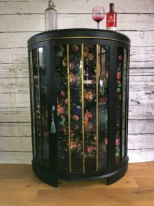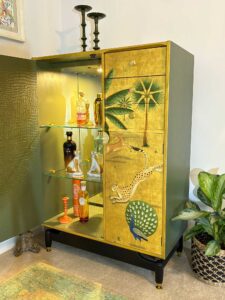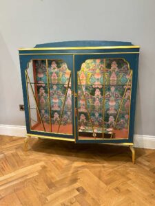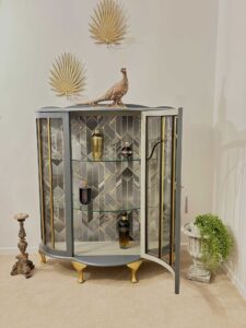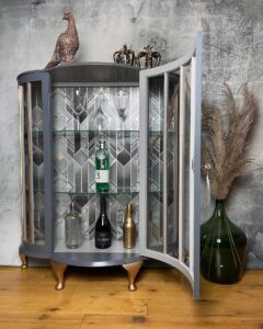 First things first, our client wanted the whole outside and the inside transformed into a mini drinks bar. We added mirrors and art deco frosting to the mirrors. We carried this design throughout the whole piece by emulating it in the painting and the accessories, and funky hanging brass glass stores were added. The whole unit received a satin varnish to give it that polished look. I tell you, seeing the transformation unfold before our eyes was nothing short of magical, and we’d do it all again in a heartbeat.”