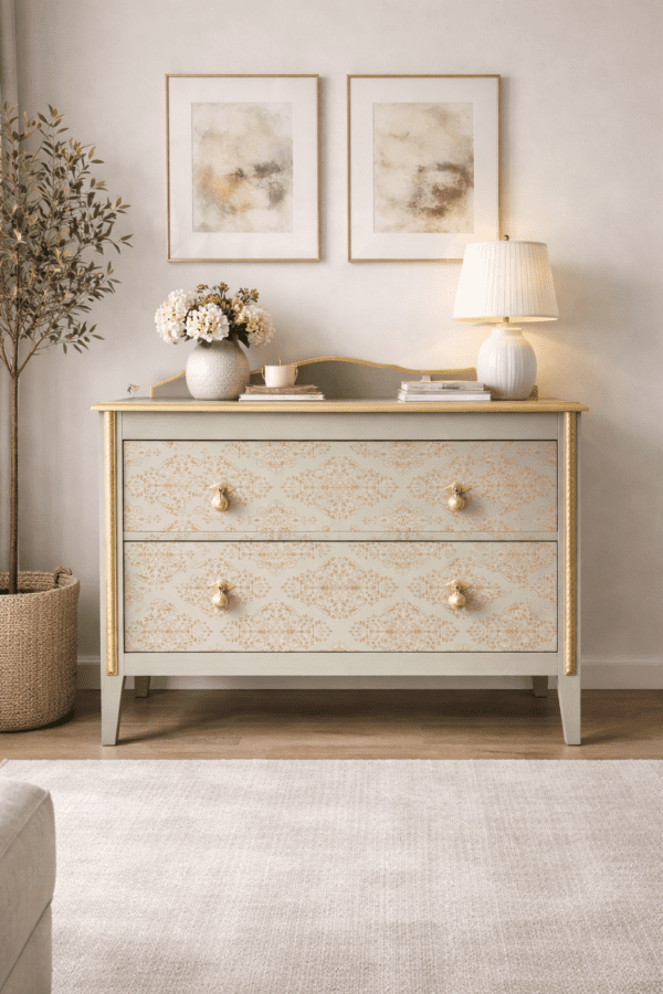 A beautiful solid oak chest of drawers that has been completely stripped and sanded back from all its old dark varnish. Painted in Fusion Mineral Paint, the colour is a very pale soft green. The gorgeous damask design has been added to the front. I decided to leave the top in the pale natural oak colour. Gold leaf has been added to all the trim and then the whole cabinet has been varnished in a durable satin varnish. The inside of the drawers have had a touch of glamour as well by adding a beautiful gold honeycomb wallpaper to finish off the cabinet.