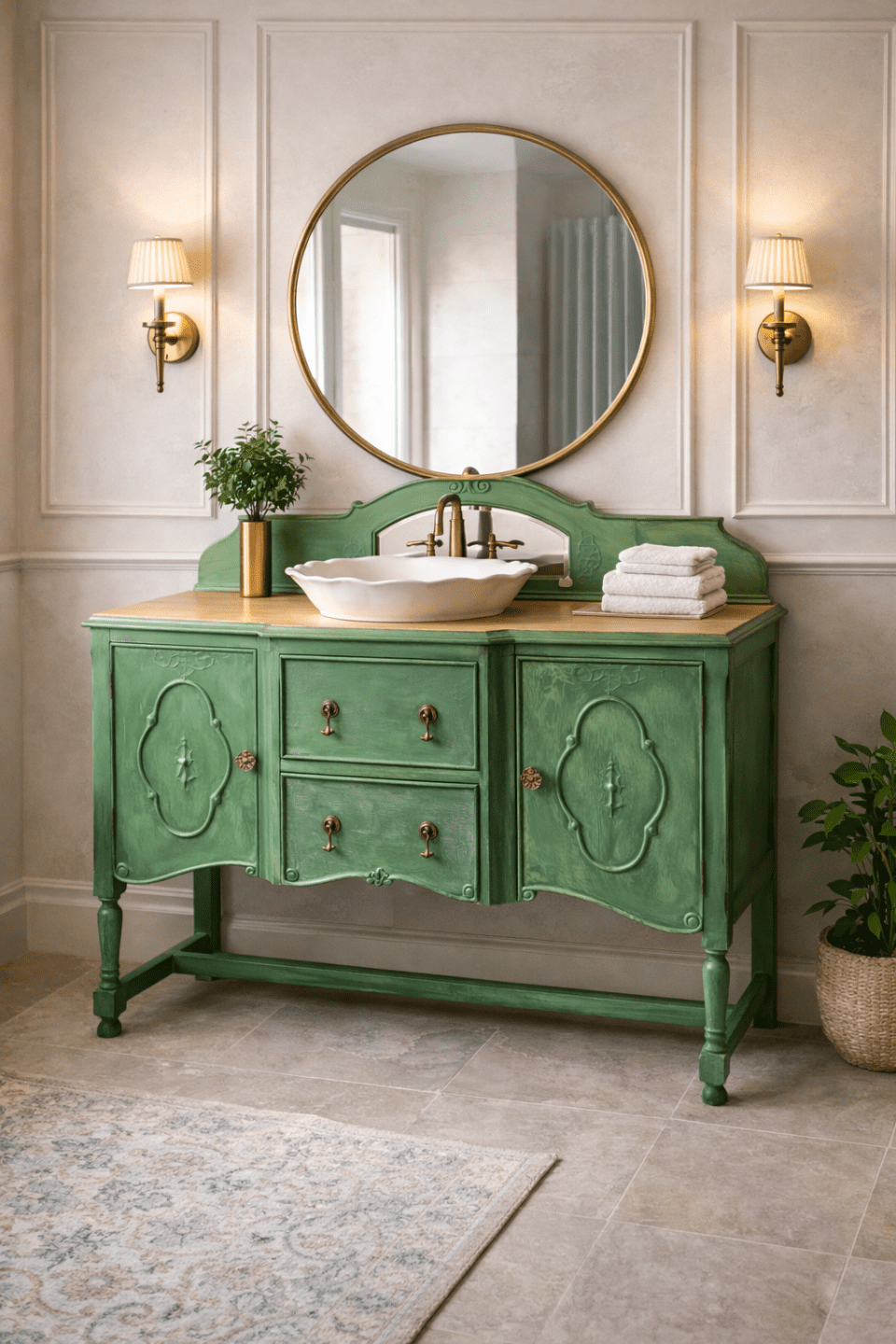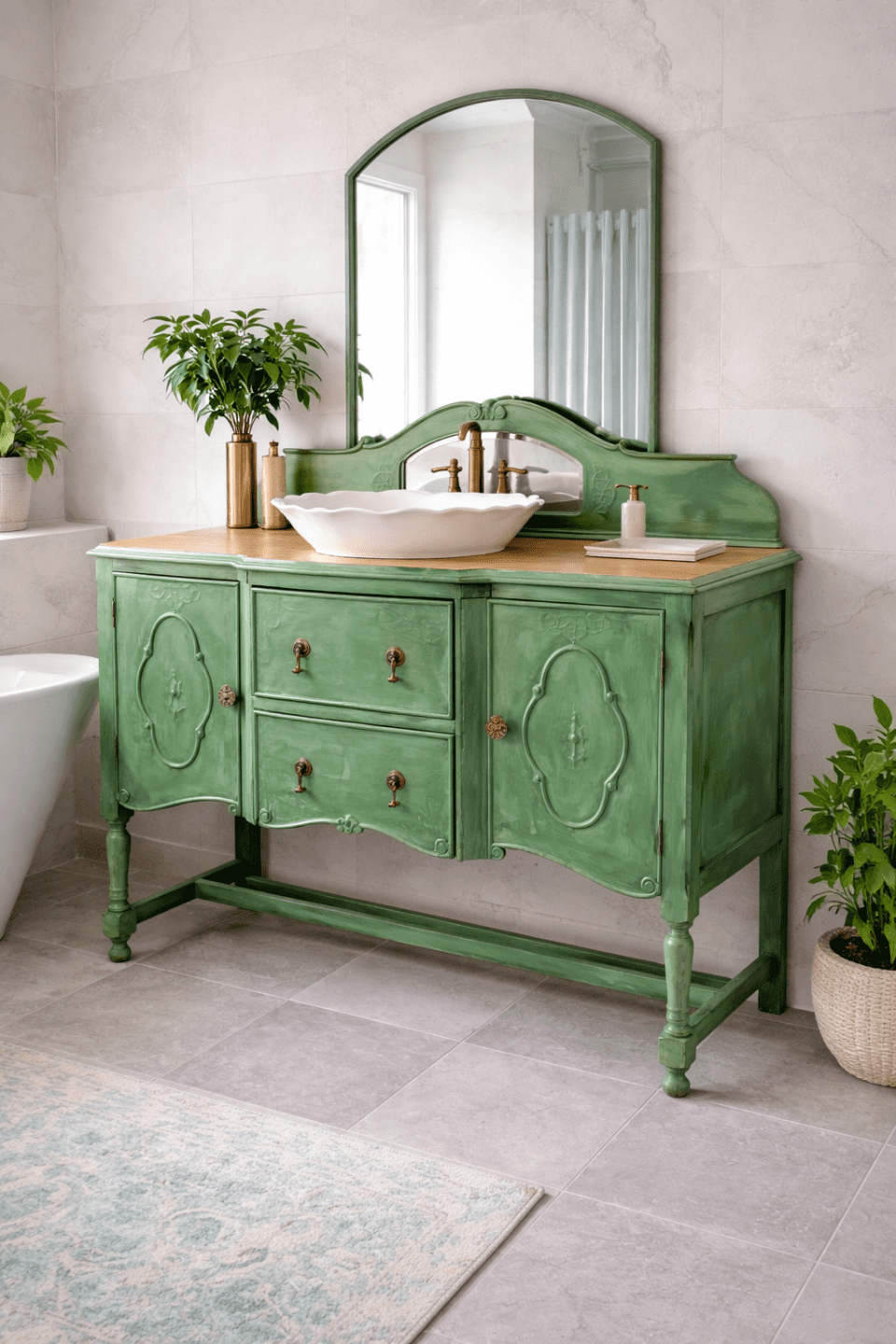 This beautiful Jacobean Style Sideboard has now sold. I can however recreate something similar for you. It was dark and dull and its now been given a fresh funky bright look. Using a mixture of textures and colours from Annie Sloan paint giving it a very vibrant look. Inside its been finished in a complimentary blue and the gorgeous Laurence Llewelyn-Bowen Suburban Jungle design. The mirror on top can be removed (if you don’t wish to have it on and the holes can be plugged with pale oak dowels.